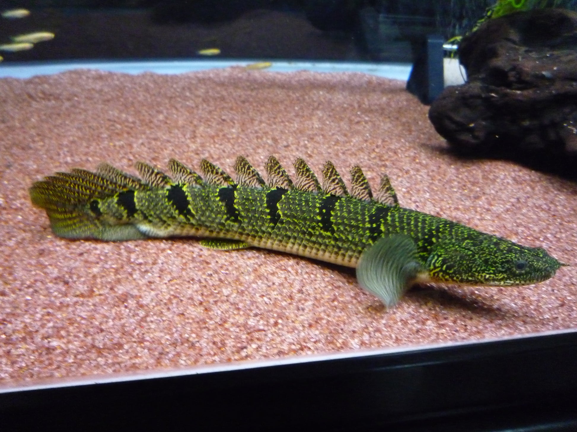 Appearance: Greyish-green with yellow flecks, 7–8 dark bands, ganoid scales, and 10–13 dorsal finlets.