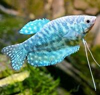 Opaline Gouramis are a stunning colour variation of the Three-Spot Gourami, featuring a marbled blue and white pattern. They are peaceful but can be territorial with other gouramis.