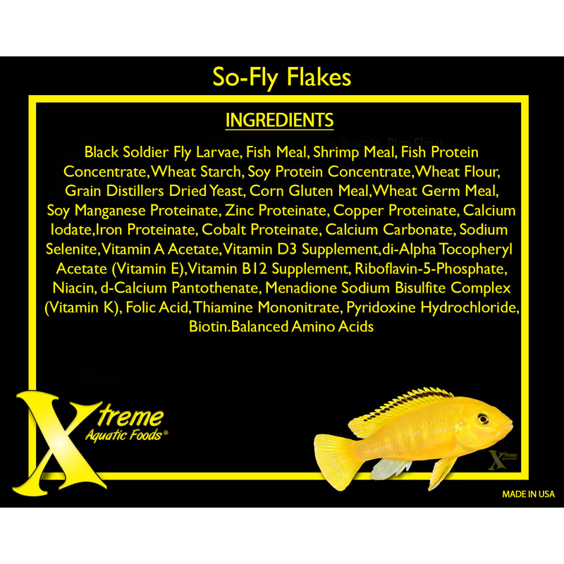 Fish love eating insects, larvae and flies in the wild, and Xtreme So-Fly Flakes provide your prized aquarium fish with the closest thing to an all-natural diet but in a clean and easy-to-use format.
