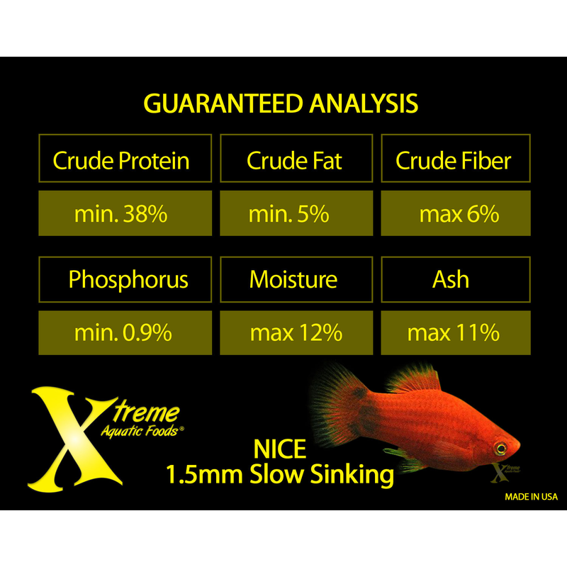 Xtreme NICE Pellets are something quite different and a great secondary food to really boost your fish’s natural colours. NICE stands for Naturally Intense Color Enhancer and these slow-sinking 1.5mm pellets will sink slowly through the aquarium’s water column. We recommend feeding only what can be eaten in 3 minutes, 5 tops.